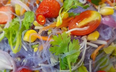 ยำวุ้นเส้นดอกอัญชัน เครื่องปรุง ฤทธิ์เย็น 1.วุ้นเส้น 2.ข้าวโพด 3.มะเขือเทศ 4.เห็ดเข็มทอง 5.อัญชัน ฤทธิ์ร้อน 6.แครอท 7.สตรอว์เบอร์รี่...